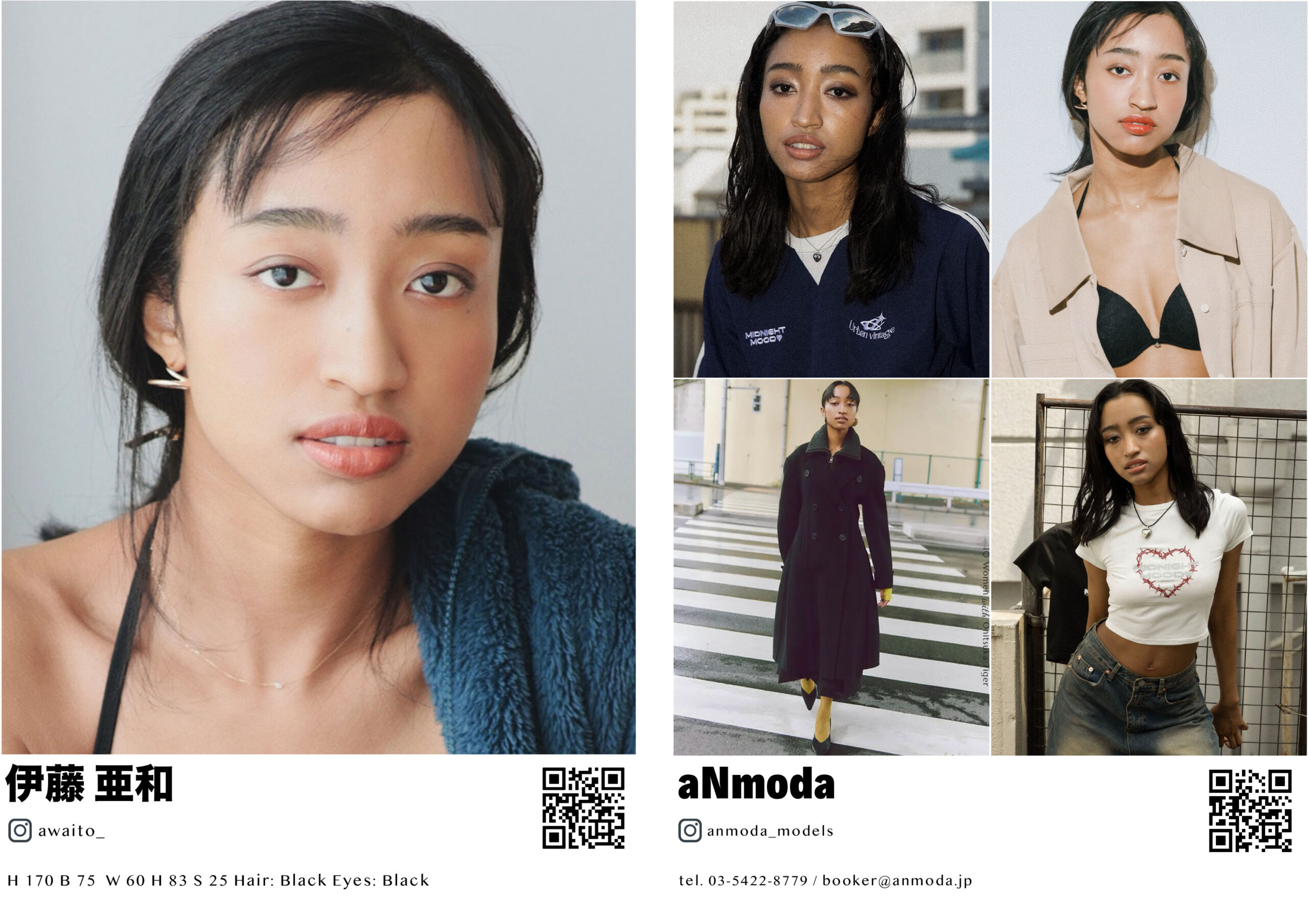 HOME ⁄ WOMEN ⁄ 伊藤 亜和 伊藤 亜和 Height170 Bust75 Waist60 Hips83 Shoes25 HairBlack EyesBlack COMPOSITE POLAROID MOVIE BOOKING